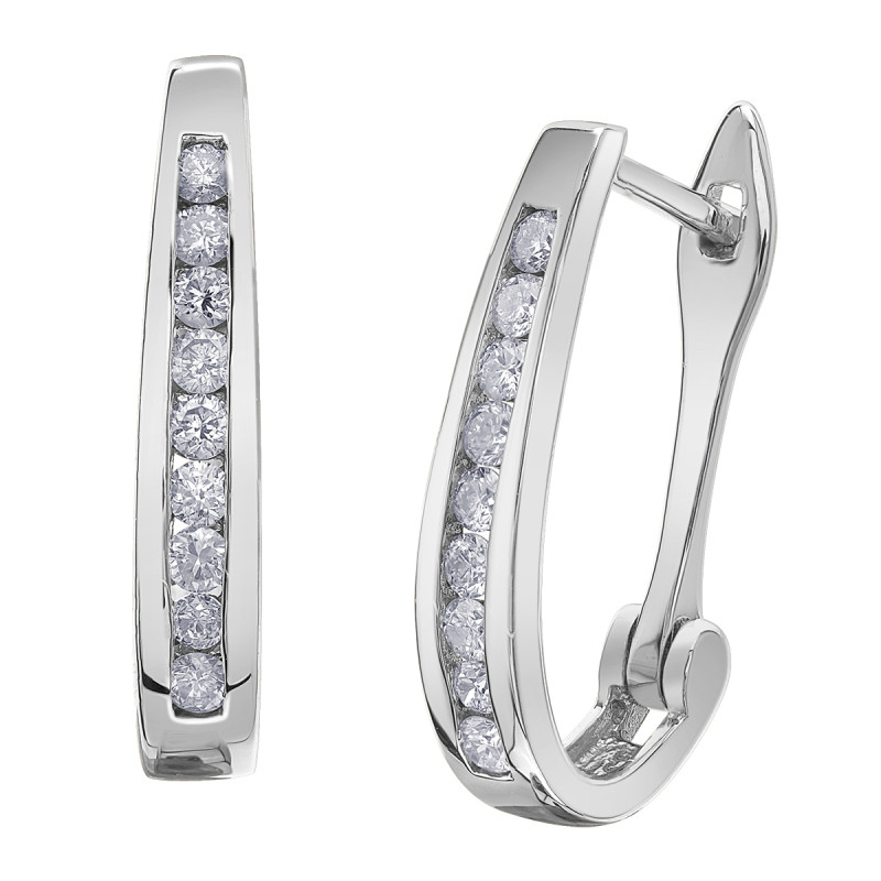10K Certified Canadian white gold hinged hoop earrings, each featuring 9 channel set diamonds with a total diamond weight of 0.165 carats (0.33 for the set).