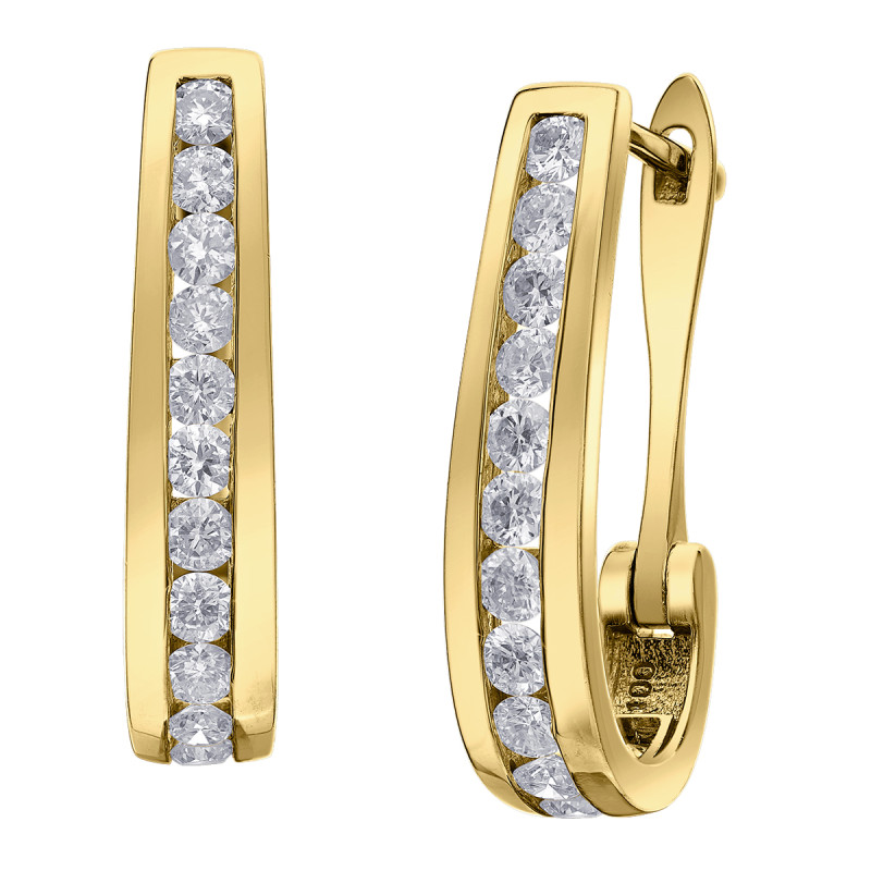 10K Certified Canadian yellow gold hinged hoop earrings, each featuring 13 channel set diamonds with a total diamond weight of 0.50 carats (1.00 for the set).