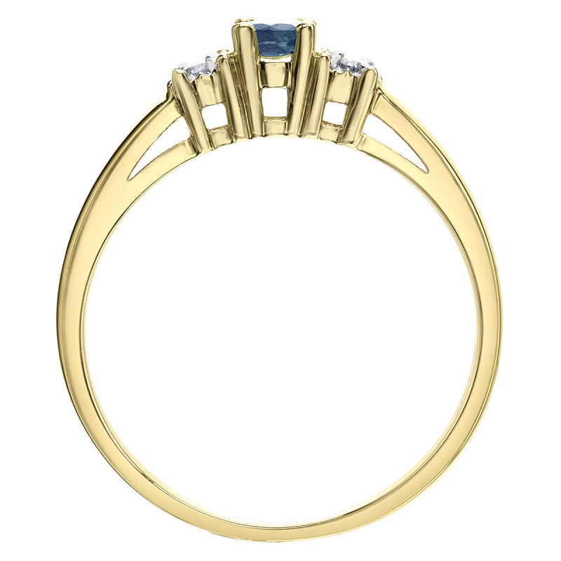 10K yellow gold ring featuring a 3.5mm round cut sapphire accented by two diamonds with a total weight of 0.04 carats.