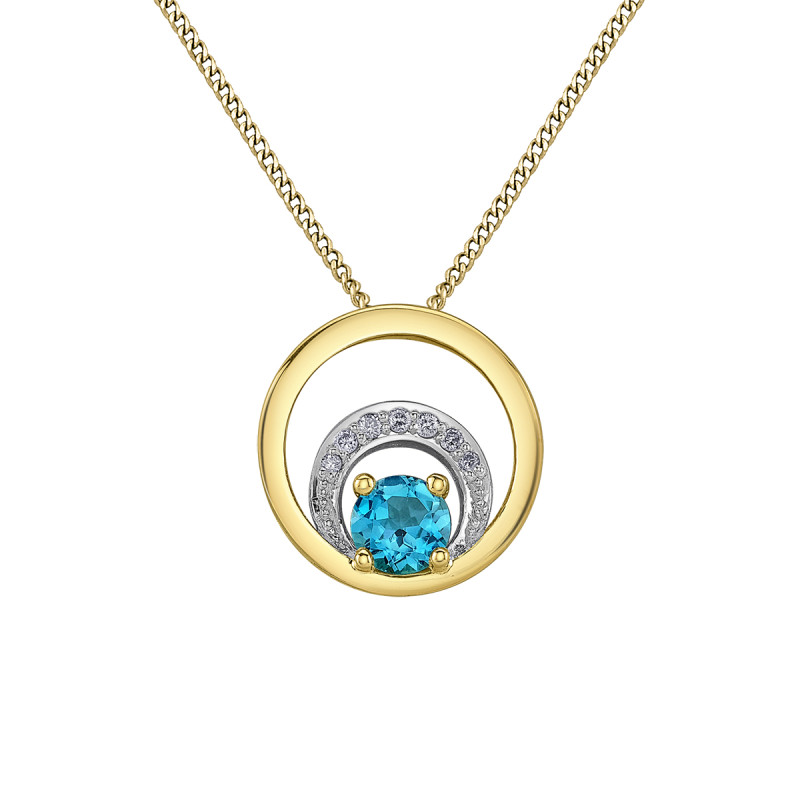 10K Certified Canadian yellow and white gold pendant set with a 4.00mm round cut blue topaz surrounded by a ring of diamonds with a total diamond weight of 0.03 carats.