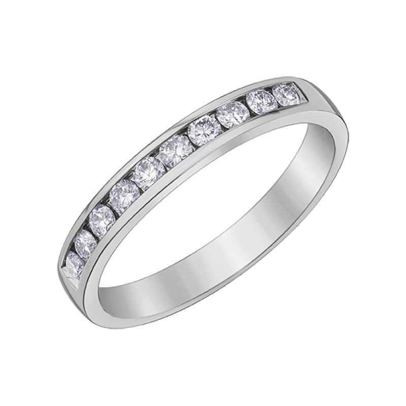 14K white gold band containing diamond of 0.33ct total weight in a channel setting.