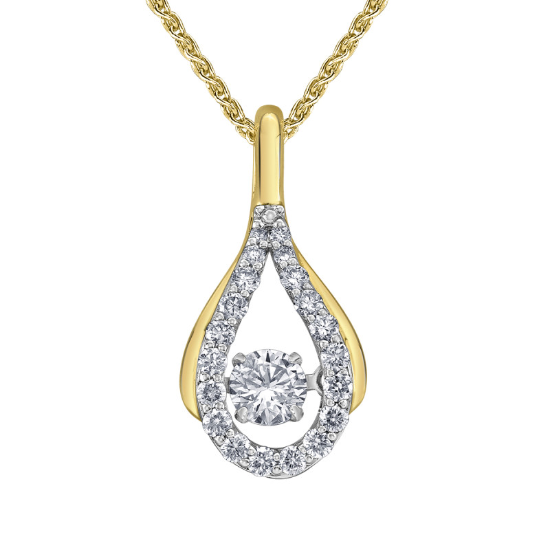 10K yellow and white gold pendant featuring a 0.15 carat diamond set in patented Pulse⢠setting, which allows the diamond to vibrate and create a continual sparkle created by the slightest movement of the wearer. The pendant is accented by twenty additional diamonds with a total weight of 0.16 carats.