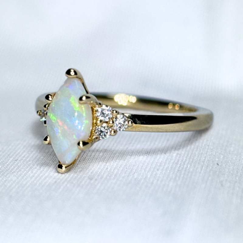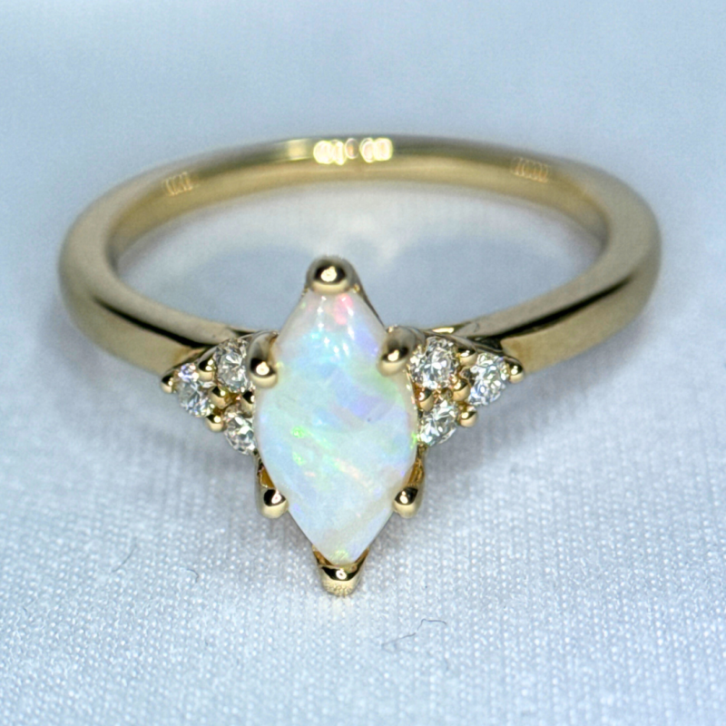 10K Certifed Canadian yellow gold ring set with a 10x5mm marquise shaped white oval cabochon and: