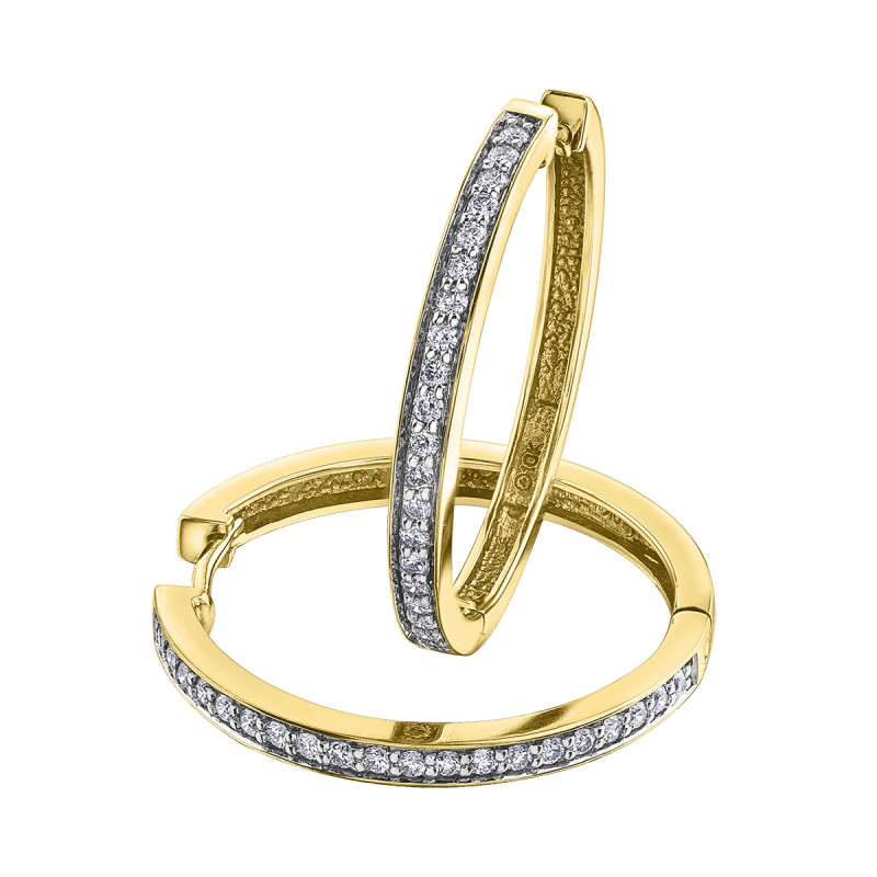 10K Certified Canadian yellow gold hinged hoop earrings, each featuring 20 diamonds with a total diamond weight of 0.25 carats (0.50 for the set).