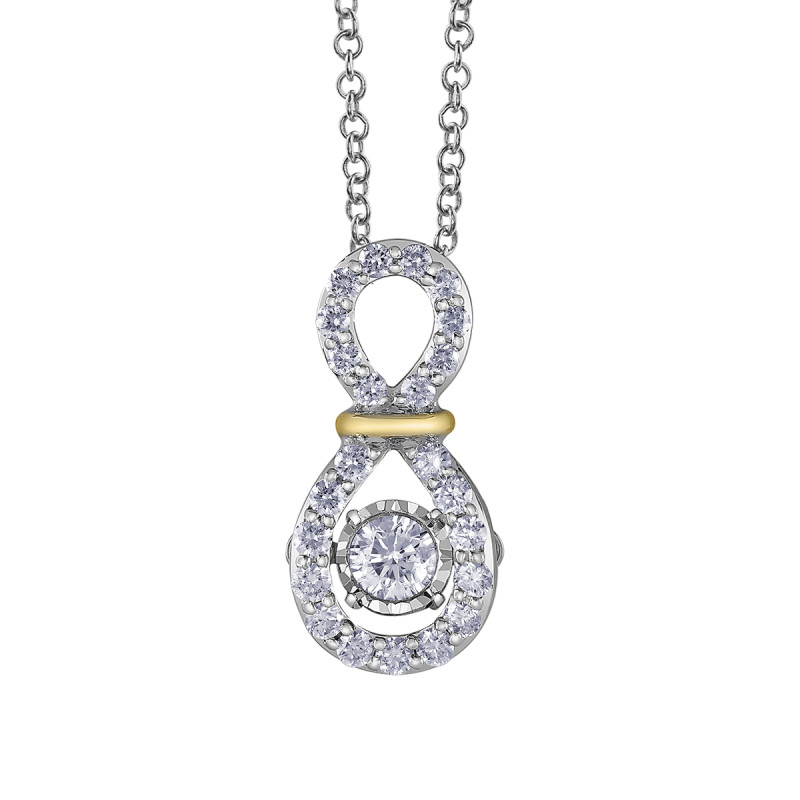10K white and yellow gold pendant featuring a 0.10 carat diamond in a patented Pulse⢠setting, which allows the diamond to vibrate and create a continual sparkle created by the slightest movement of the wearer. The pendant is also studded with diamonds, bring the total diamond weight of the pendant to 0.30 carats.