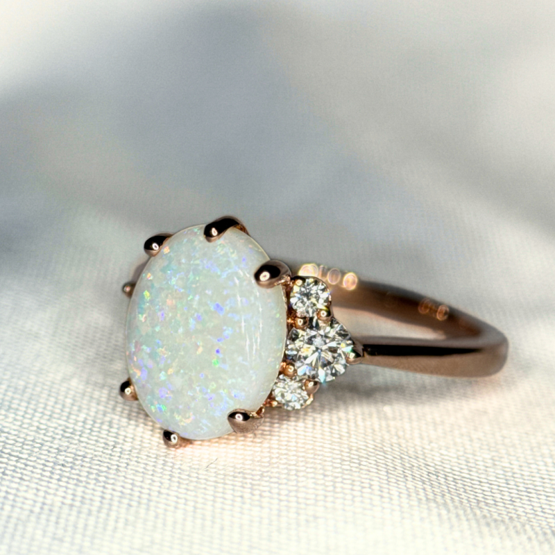 14K Certifed Canadian rose gold ring set with 10x8mm white oval cabochon and: